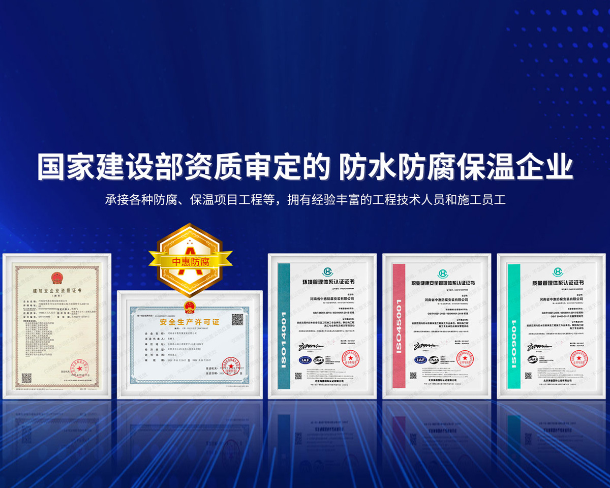 公司經營范圍:防水防腐保溫工程;消防設施工程;建筑裝修裝飾工程;建筑機電安裝工程;電力工程;建筑工程;石油化工工程;工業清洗工程;油罐清洗工程;鋼結構工程;環保工程;模板腳手架工程;電纜防火封堵、防污閃噴涂、外墻外保溫工程;各類施工勞務作業;設備維修、船舶鉚焊、涂裝;電力工程材料、建材、防水材料、防火材料、防腐保溫材料銷售,并相繼通過了GB/T19001-2008idtISO9001:2008GB/T50430-2007質量管理體系認證證書。GB/T24001-2004idtISO14001:2004環境管理體系認證證書。GB/T28001-2011idtOHSAS18001:2007職業健康安全管理體系認證證書。公司是中國防腐蝕于防護協會、中國施工企業管理協會、電力協會和中國鋼結構防水協會會員單位。 公司的經營業務涵蓋了石油、化工、電力、冶金、煤炭、船舶、國防、燃氣、水利、環保、交通運輸、航空及國防軍工和輕紡市政等行業的防腐保溫絕熱設備。鋼結構安裝、防火、防水、金屬噴鍍、聚脲噴繪、陰極保護、防滲透堵漏、玻璃鋼及各種磚版材料襯里、橡膠襯里、煙氣硫和耐酸溶劑腐蝕等工程施工。公司連續十年榮獲“省市先進施工企業”“安全生產先進單位”“重合同,守信用企業”和“AA***資質企業”的稱號。2000年被命名為市級文明單位,2002年被國家工商行政管理局命名為“重合同,守信用的企業”、被中國工業防腐蝕技術協會命名為“防腐蝕企業,能源節約及環境保護領域有豐富的經驗和***的業績。工程一次交驗合格率100%。其中攀枝花鋼鐵公司煉鐵廠四號高爐及熱風爐防腐工程、上海寶鋼公司煤氣柜防腐工程、撫順石油一廠裝置防腐項目、齊魯石化公司稀烴廠高塔防腐工程、吉林化學工業公司煉油廠油罐防腐工程、天津石化熱電廠六號爐頂棚聯絡管保溫工程、大慶油田(太倉)力神泵業工程、中國化學工程第十一建設工程、中原油田勘探局工程、中國石化銷售有限公司華北分部、魯皖輸油管道工程、貴州開磷息烽合成氨工程、陜西黃陵煤化工程、中國石油天然氣西部管道塔里木輸油工程、邯鋼集團邯寶鋼鐵公司煉鐵工程、德州供電工程、吉寶(南通)船廠工程,偃師華潤熱力工程、鄭州熱力總公司。 河南省中惠防腐安裝有限公司愿以豐富的施工經驗,***的技術,***的設備,***的管理,***的服務,竭誠為國內外廣大的用戶提供***滿意、******的工程作品。 我公司愿與國內外同仁一道,團結協作,共同推進防腐蝕行業發展! 公司地址:河南省長垣縣建設路北段360號 固定電話:0373-8866488 郵編:453400 網址:http://www_zhff_com_cn.falaowangderongyao.com